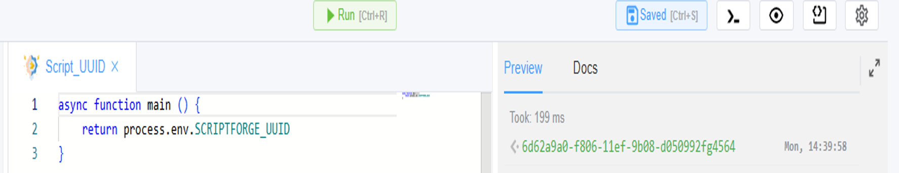 process.env.SCRIPTFORGE_UUID - SCRIPTFORGE_NAME: Name of the ScriptForge file.