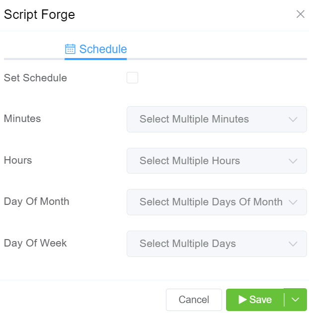 The Schedule option allows to you run your Script Forge based on pre-determined dates in month, days of a week and you can even select the time by selecting the values of minutes and hours from the drop-down menu.