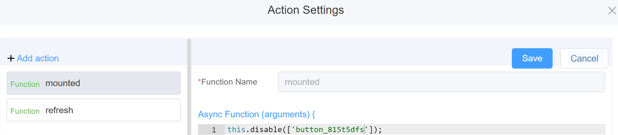 | Action Settings | Click on the drop-down to select the pre-defined methods you wish to apply to your component. In this case, you can choose either mounted or refresh for onClick |