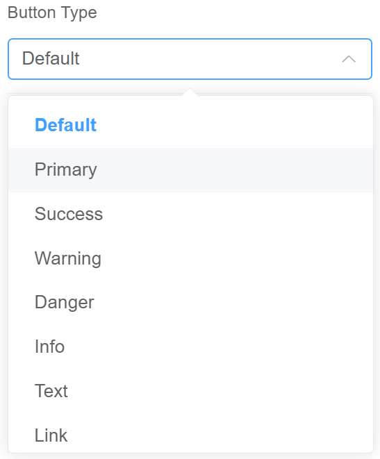 | Button Type | Select the type of button from: Default, Primary, Success, Warning, Danger, Info, Text, or Link | ![]() |