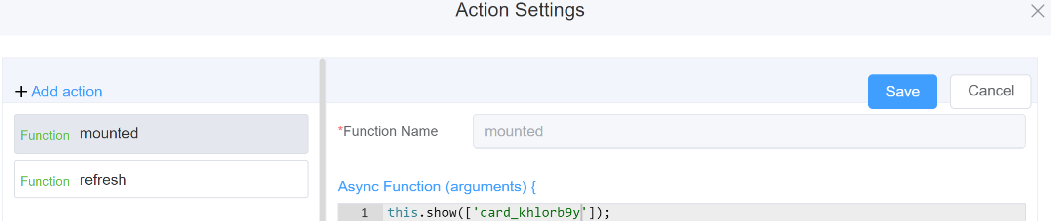 var fields= ['card_khlorb9y'] this.show(fields)this.getComponent('component_ID')1 2