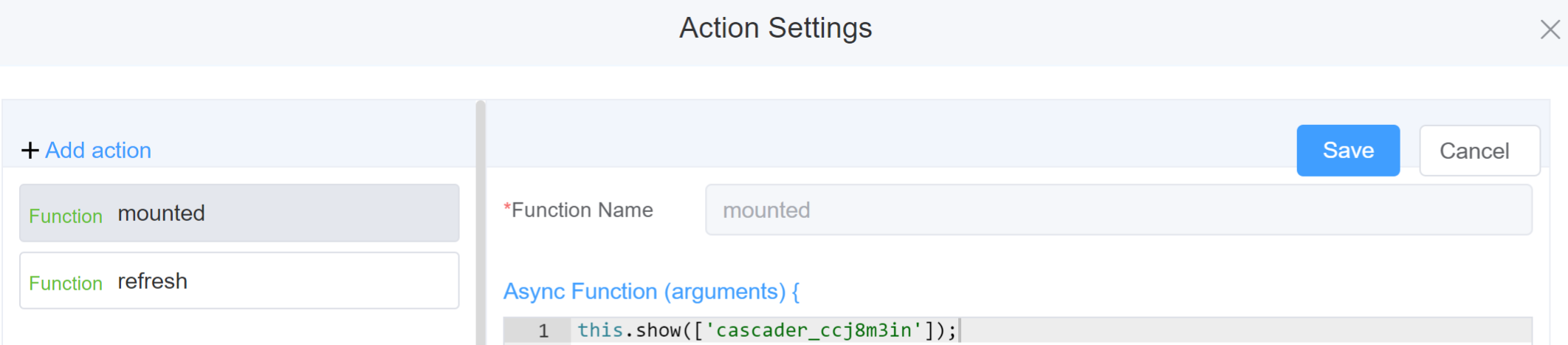 | Action Settings | Click on the drop-down to select the pre-defined methods you wish to apply to your component. In this case, you can choose either mounted or refresh for onChange, onFocus, or onBlur |