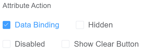 | Attribute Action | Enable Data Binding to connect the data to UI Enable Hidden action to hide the fieldEnable Disabled action to make the field unusable Enable Show Clear button action to make the clear button visible. |