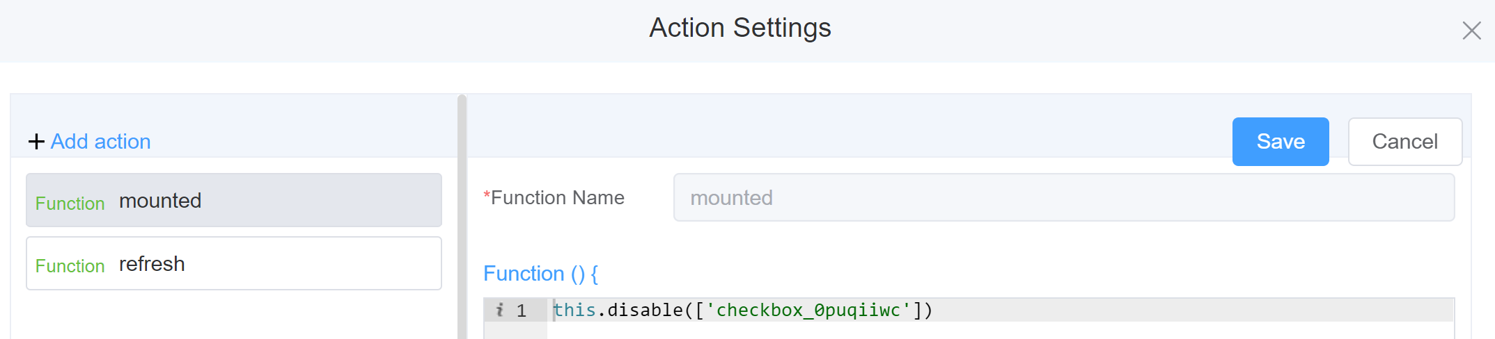 | Action Settings | Click on the drop-down to select the pre-defined methods you wish to apply to your component. In this case, you can choose either mounted or refresh for onChange |