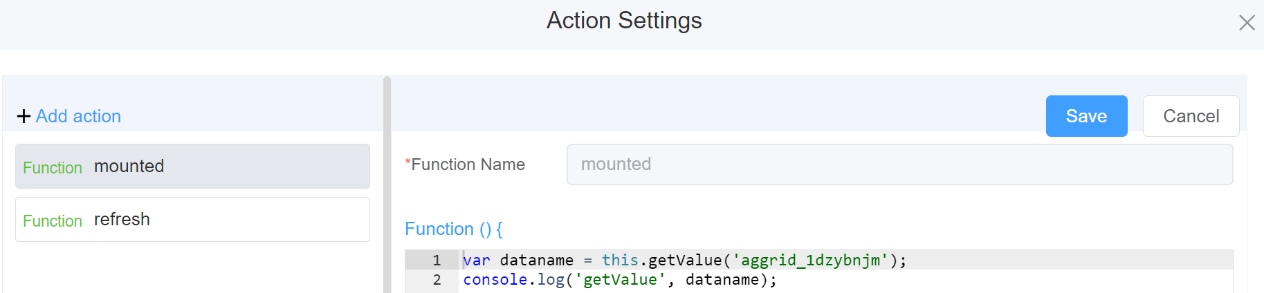 var dataname = this.getValue('aggrid_nd93m43c'); console.log('getValue', dataname); -
