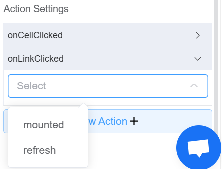 | Action Settings | Click on the drop-down to select the pre-defined methods you wish to apply to your component. In this case, you can choose either mounted or refresh for onCellClicked, or onLinkClicked |