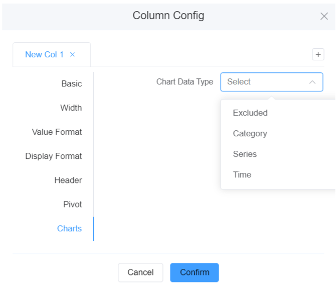 To use the Charts option, first enable the Enable Range Selection option. Click on Preview, select the values on the grid, right-click on the selected the area then Charts. Below are further filters you can apply on the charts under Column Config.