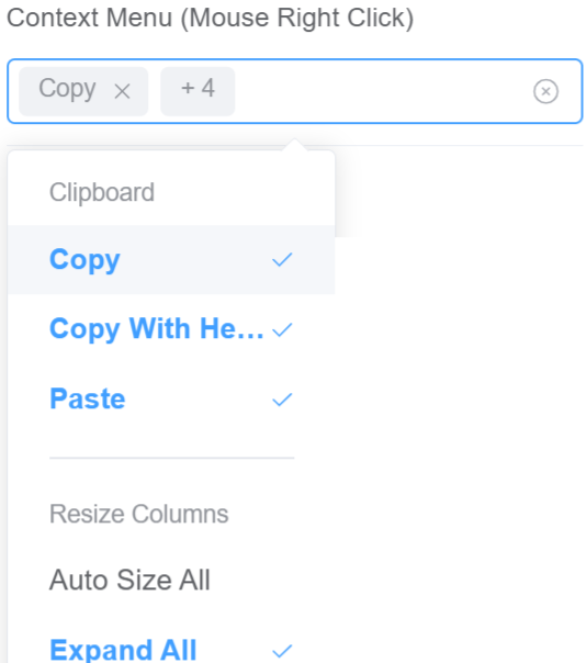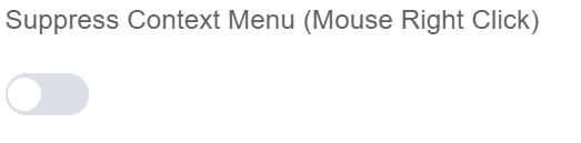 | Suppress Context Menu | When disabled, it disables the mouse right-click feature which has custom options like export into .CSV file or Excel, copy or copy with headers, etc. and instead the browser default and generic right-click options become available |