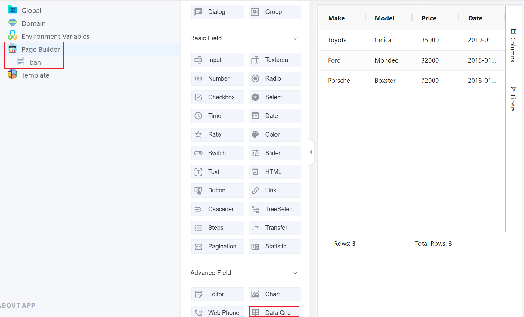 Data Grid is a tabular data display component. It enables you to add different functionalities.