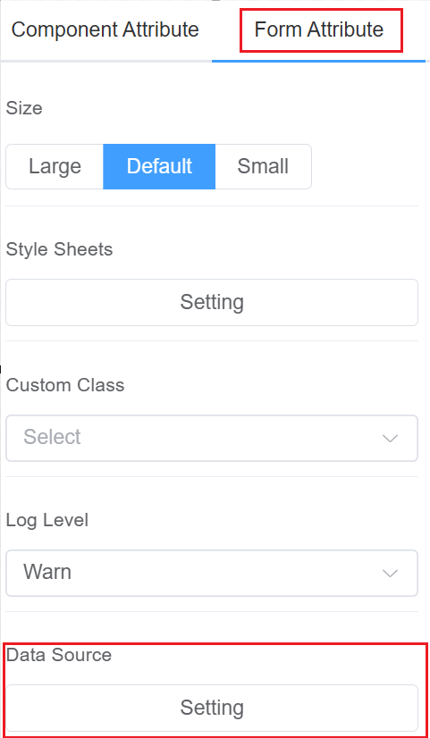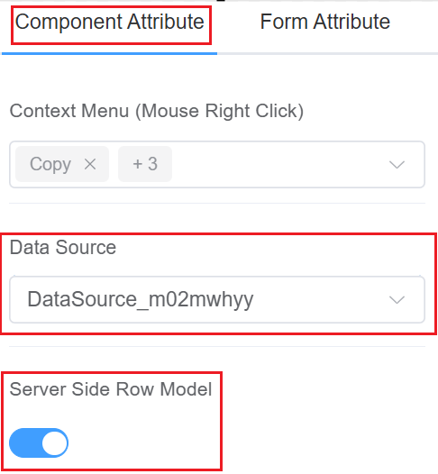 - Click on Component Attribute, select the saved Data source and enable the Server Side Row Model.