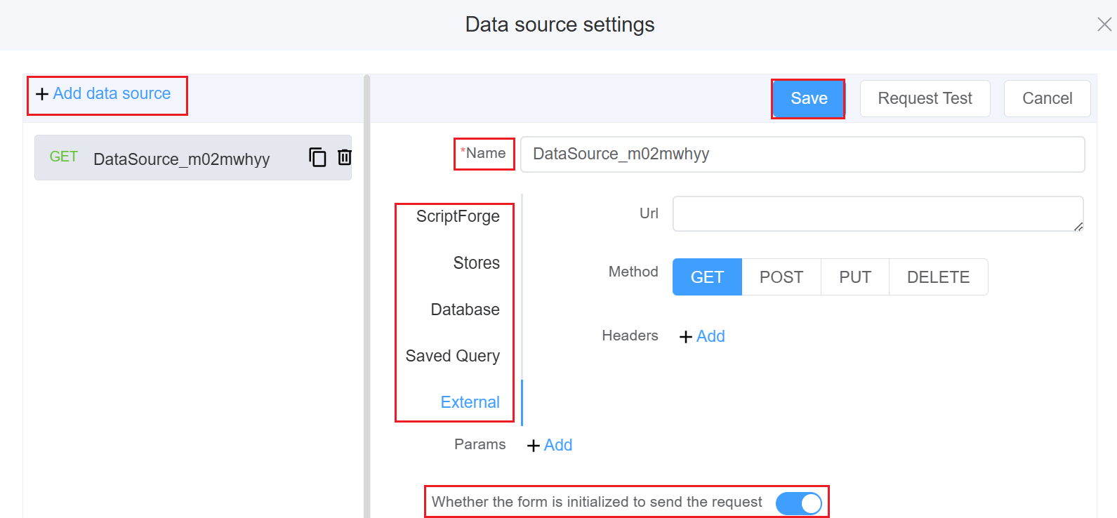 Whether the form is initialized to send the request(for auto-loading the data source). Click onSave.