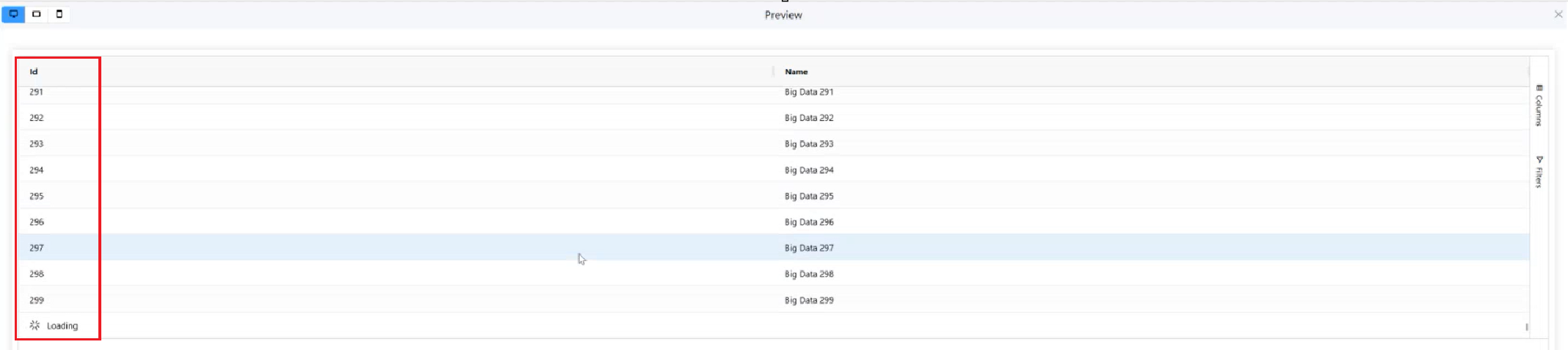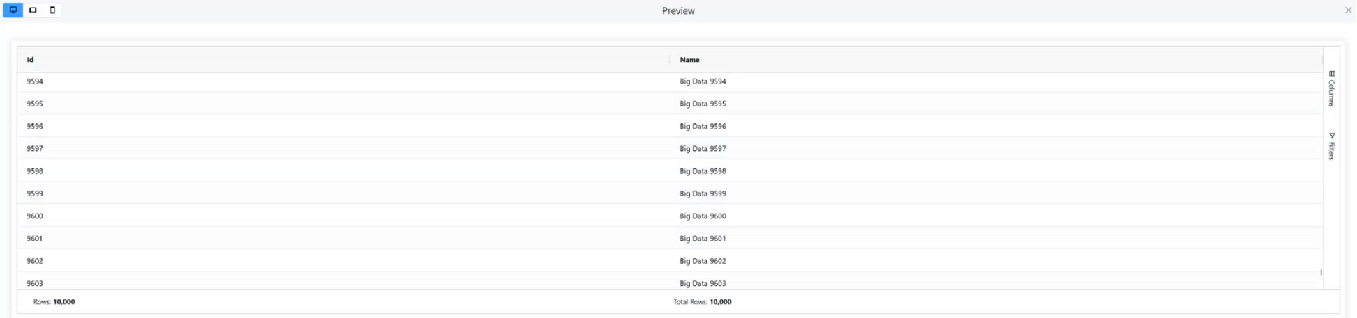 Preview. You will see that all the data has been auto-loaded in one go (10,000 rows of data). This type of loading is the Infinite scrolling.