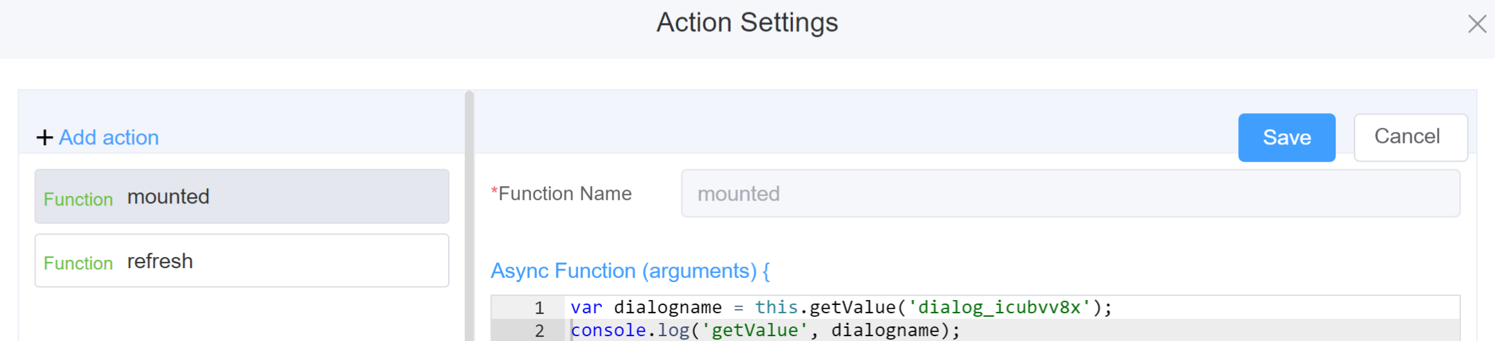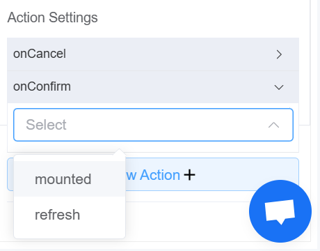 | Action Settings | Click on the drop-down to select the pre-defined methods you wish to apply to your component. In this case, you can choose either mounted or refresh for onCancel or onConfirm |