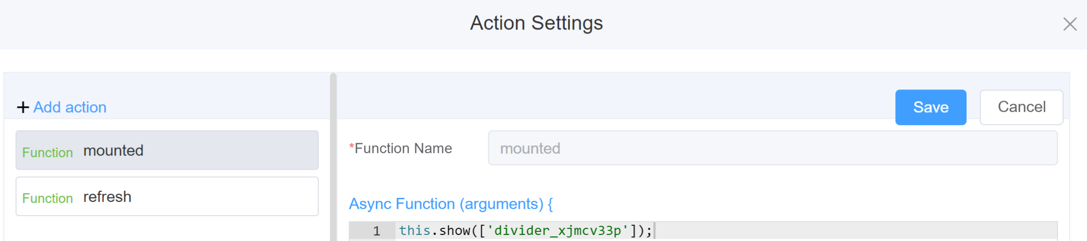 - Go to Form Attribute Action Panel Setting (Mounted | refresh | click 'Add action').