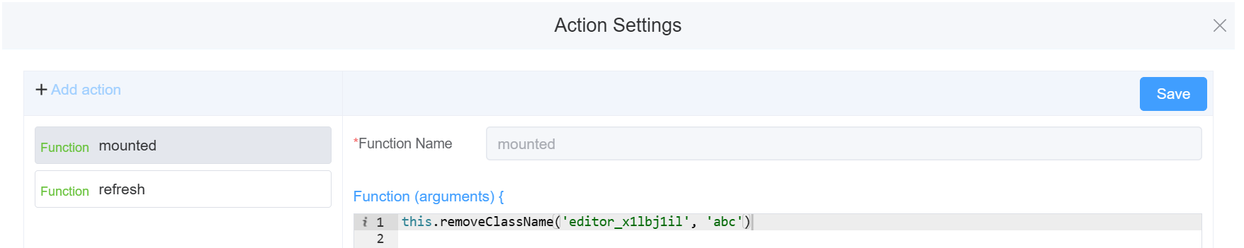 | Action Settings | Click on the drop-down to select the pre-defined methods you wish to apply to your component. In this case, you can choose either mounted or refresh for onChange |