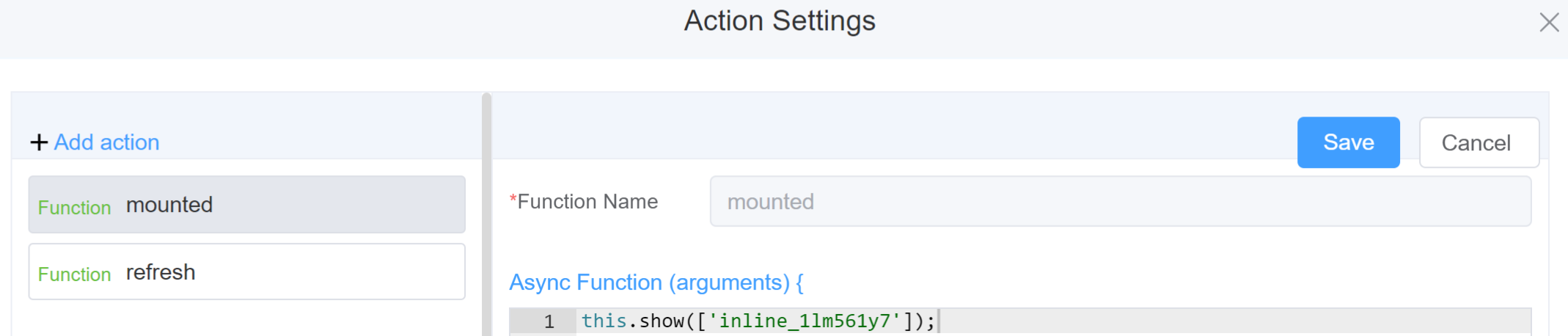 - Go to Form Attribute Action Panel Setting (Mounted | refresh | click 'Add action').