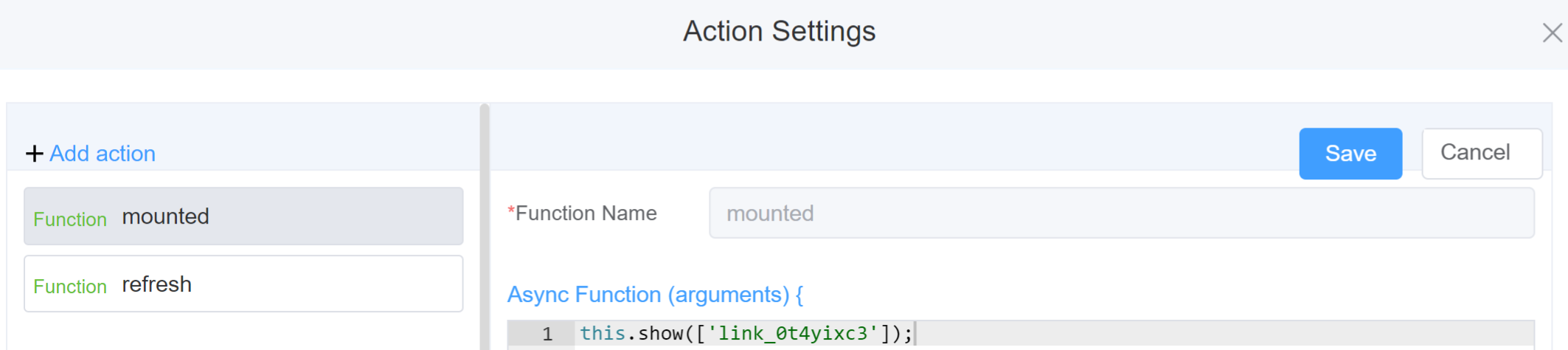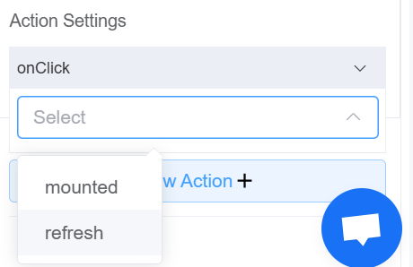 | Action Settings | Click on the drop-down to select the pre-defined methods you wish to apply to your component. In this case, you can choose either mounted or refresh for onClick |