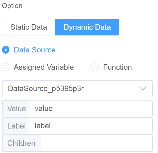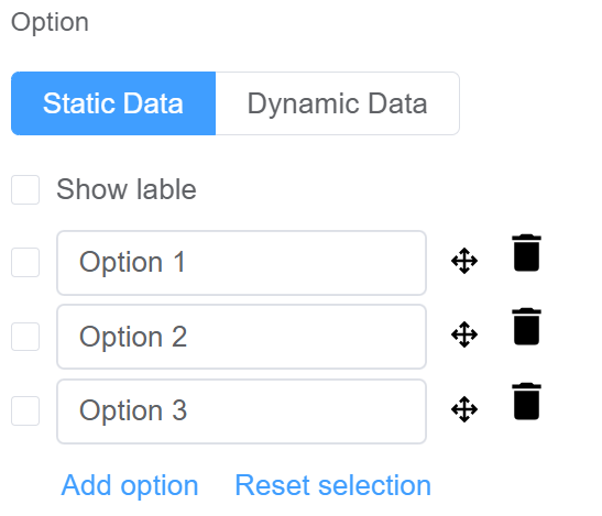| Option | Choose either Static or Dynamic way of adding data to the options of the Select Static data refers to a fixed set of options that are pre-defined and loaded into the select at the time of initialization Dynamic data are options fetched as needed from sources like databases or APIs. The select updates choices based on user selections. You select from Data source which refers to the origin of the data; Function which refers to the code that manipulates the data, and Assigned Value which refers to the specific value stored or associated with a data element |