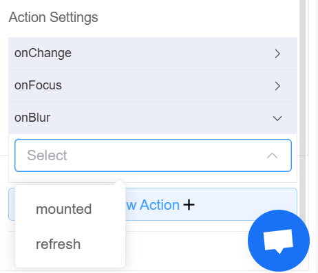 | Action Settings | Click on the drop-down to select the pre-defined methods you wish to apply to your component. In this case, you can choose either mounted or refresh for onChange, onFocus, or onBlur |