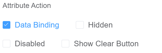 | Attribute Action | Enable Data Binding to connect the data to UI. Enable Hidden action to hide the field. Enable Disabled action to make the field unusable. Enable Show Clear button action to make the clear button visible. |
