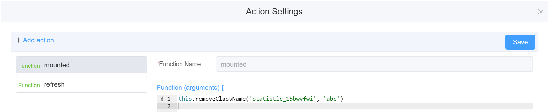 | Action Settings | Click on the drop-down to select the pre-defined methods you wish to apply to your component. In this case, you can choose either mounted or refresh for onChange |