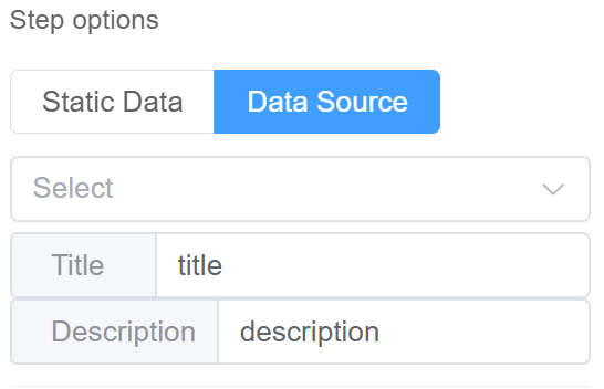 | Step Options | Static Data: Enter your own step number and description. Data Source: Dynamic data are options fetched as needed from sources like databases or APIs. Steps can also e generated from external data source. |
