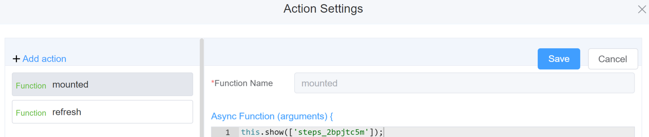 | Action Settings | Click on the drop-down to select the pre-defined methods you wish to apply to your component. In this case, you can choose either mounted or refresh for onChange |