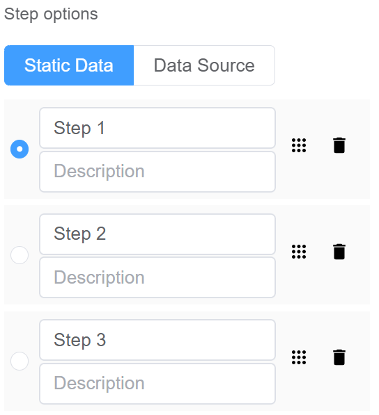 | Step Options | Static Data: Enter your own step number and description. Data Source: Dynamic data are options fetched as needed from sources like databases or APIs. Steps can also e generated from external data source. |
