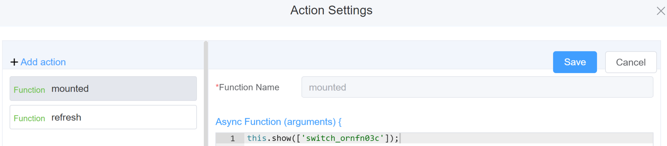 | Action Settings | Click on the drop-down to select the pre-defined methods you wish to apply to your component. In this case, you can choose either mounted or refresh for onChange |
