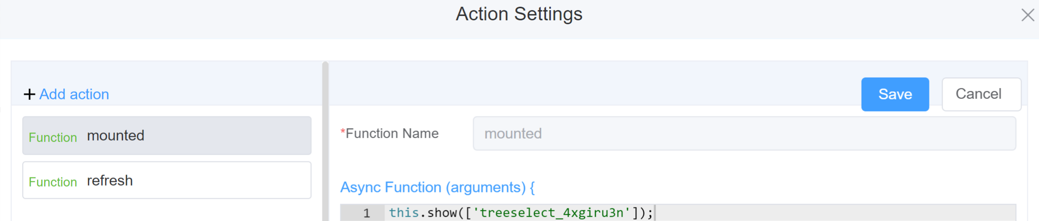 | Action Settings | Click on the drop-down to select the pre-defined methods you wish to apply to your component. In this case, you can choose either mounted or refresh for onChange, onFocus, or onBlur |