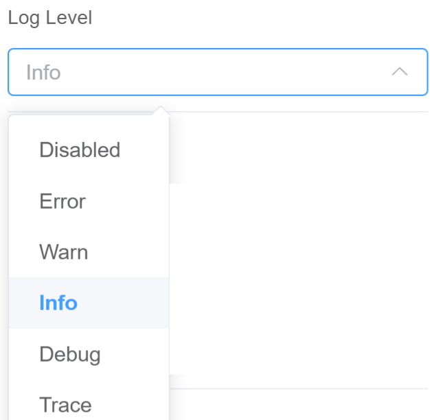 | Log Level | Log messages based on the severity of the event they describe, helping users prioritize and interpret the vast amount of information typically found in logs. 1.Disabled signifies is entirely turned off. No messages, regardless of their severity (error, warning, info, etc.), will be written to the log file. 2. Use Error log level that should be used when the application hits an issue preventing one or more functionalities from properly functioning. 3. Use Warn log for unexpected behavior happened inside the application, but it's continuing its work and the key business features are operating as expected. 4. Info An event happened, the event is purely informative and can be ignored during normal operations. 5. Use Debug level for troubleshooting or test environments to diagnose potential issues. 6. Trace Detailed code execution for deep debugging, ignored during normal operation. { label: 'Disabled', value: 5 }, { label: 'Error', value: 4 }, { label: 'Warn', value: 3 }, { label: 'Info', value: 2 }, { label: 'Debug', value: 1 }, { label: 'Trace', value: 0 } |