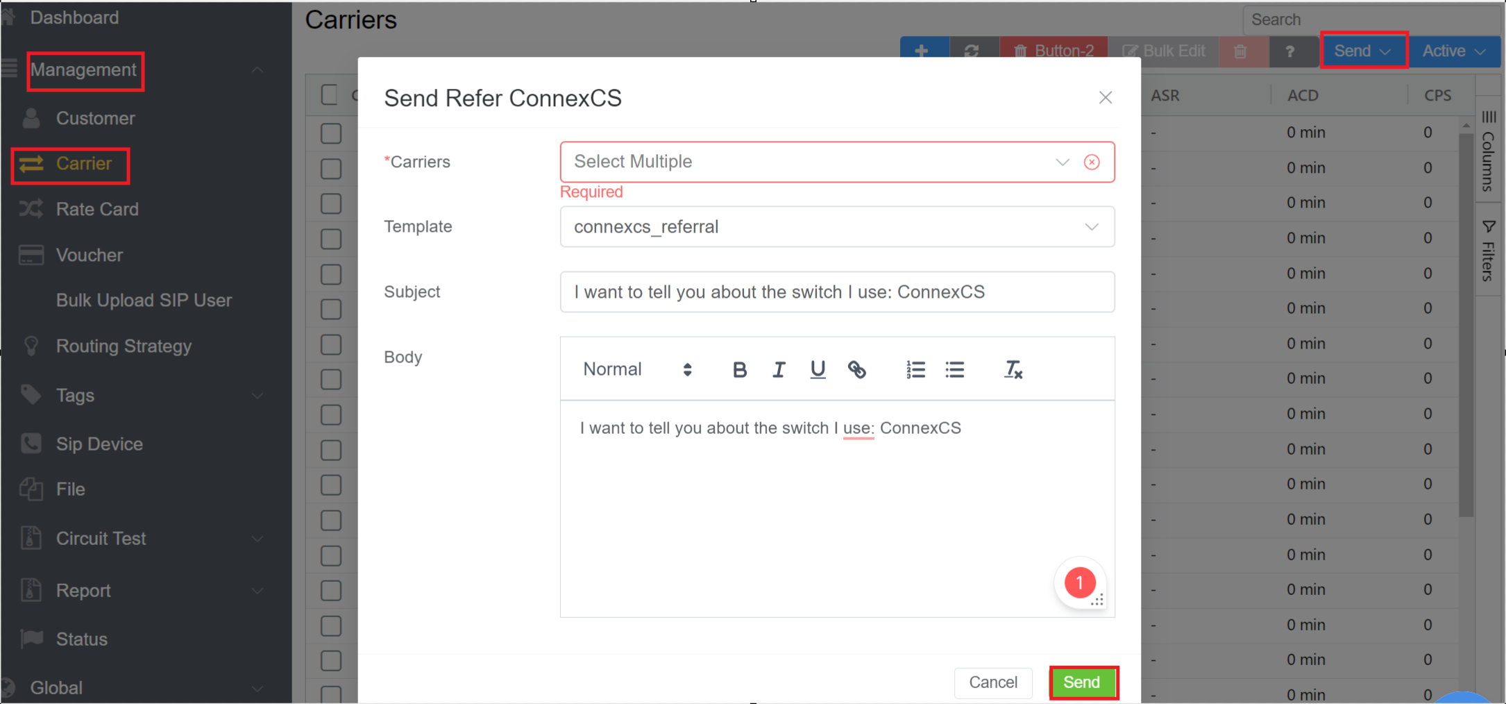 - Click on "Send" at the top right then choose Refer ConnexCS.