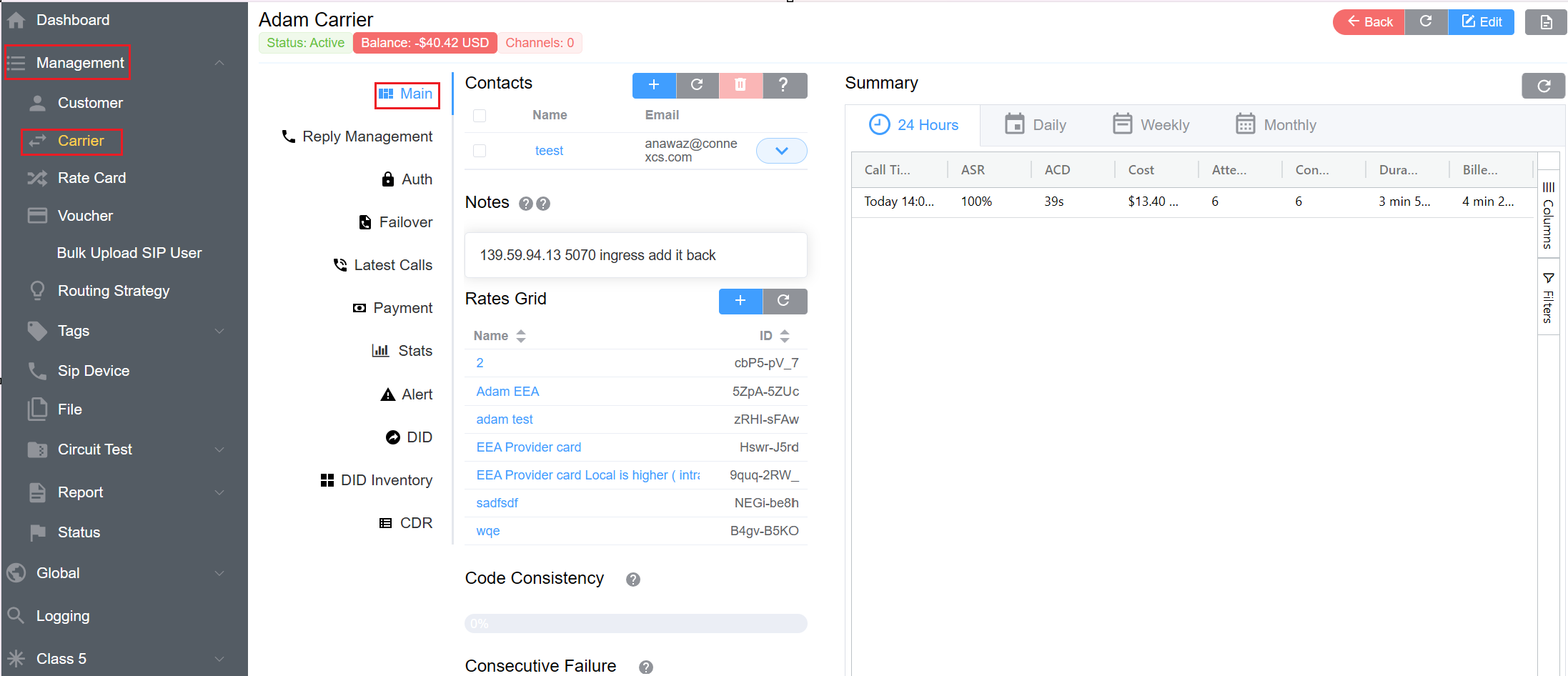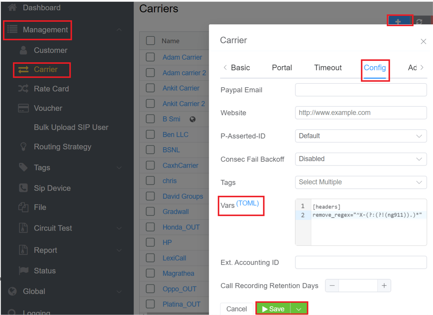Bulk Edit: Select several Carriers, then click Bulk Edit to change the fields such as Channels Status, Flow Speed (CPS), Portal Access, and Country.