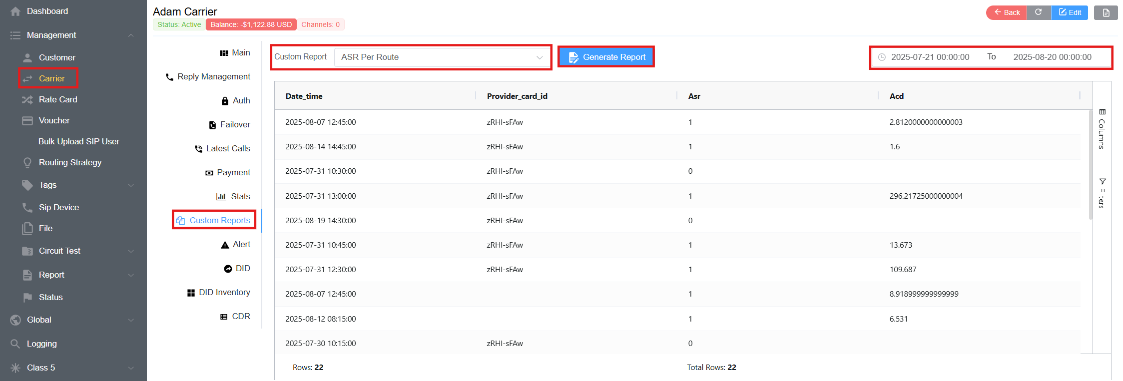 The ASR per Route Report provides detailed visibility into the Answer-Seizure Ratio (ASR) for each individual route (Provider Rate Card) configured under a single carrier.