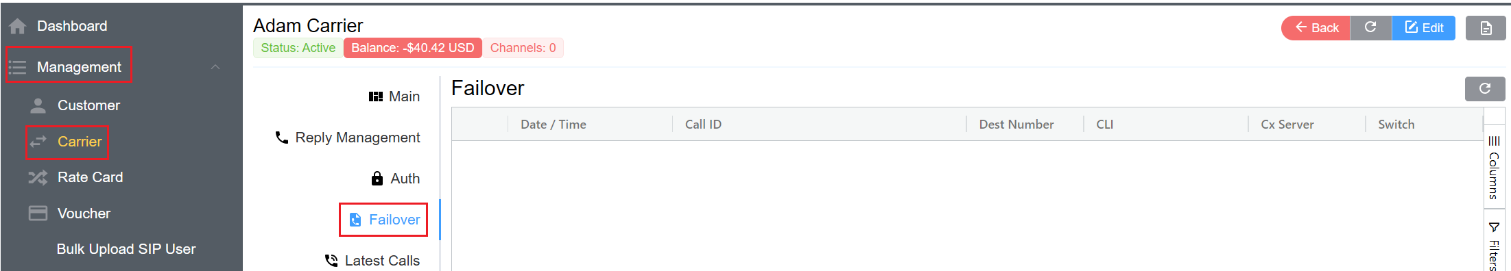 The Failover tab lists calls that failed with this carrier but connected with another carrier. This typically helps to troubleshoot an issue with the carrier that's failing the calls. You can also use this to identify FAS (False Answer Supervision) billing fraud.