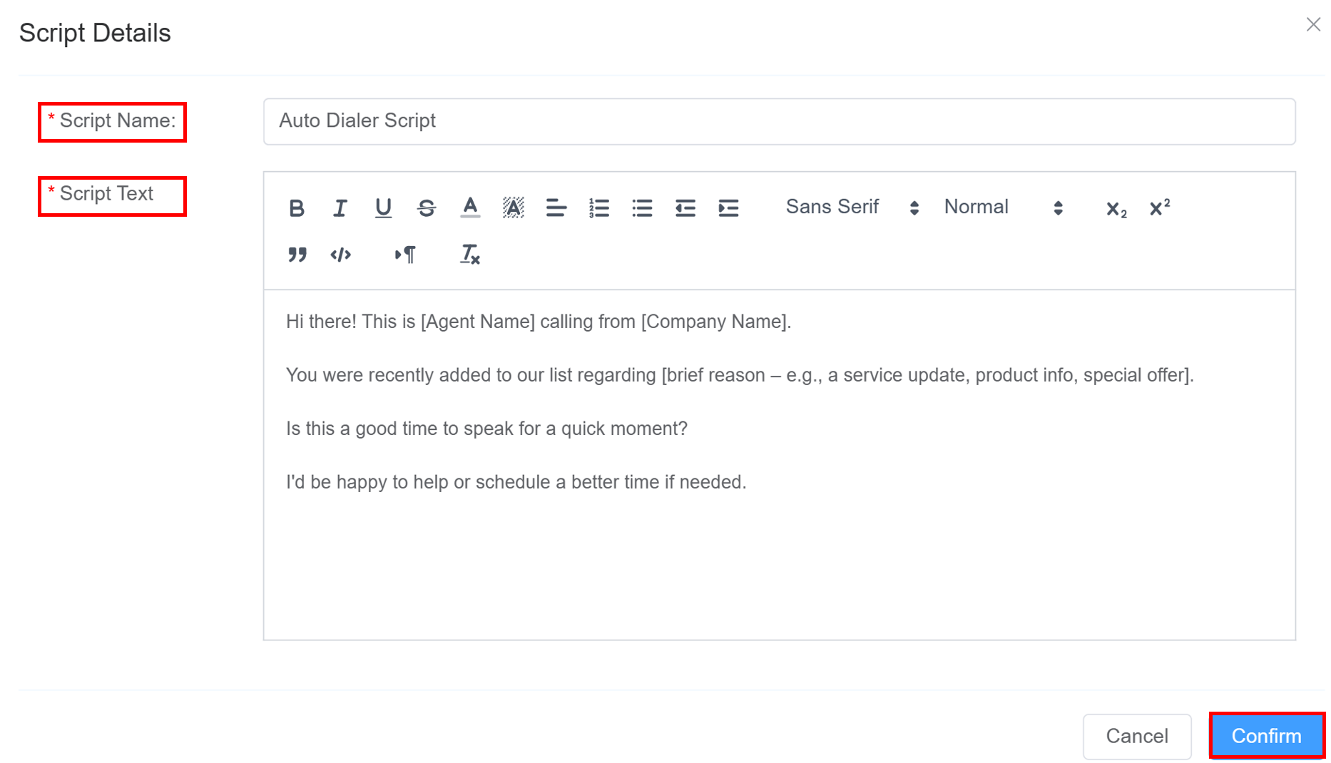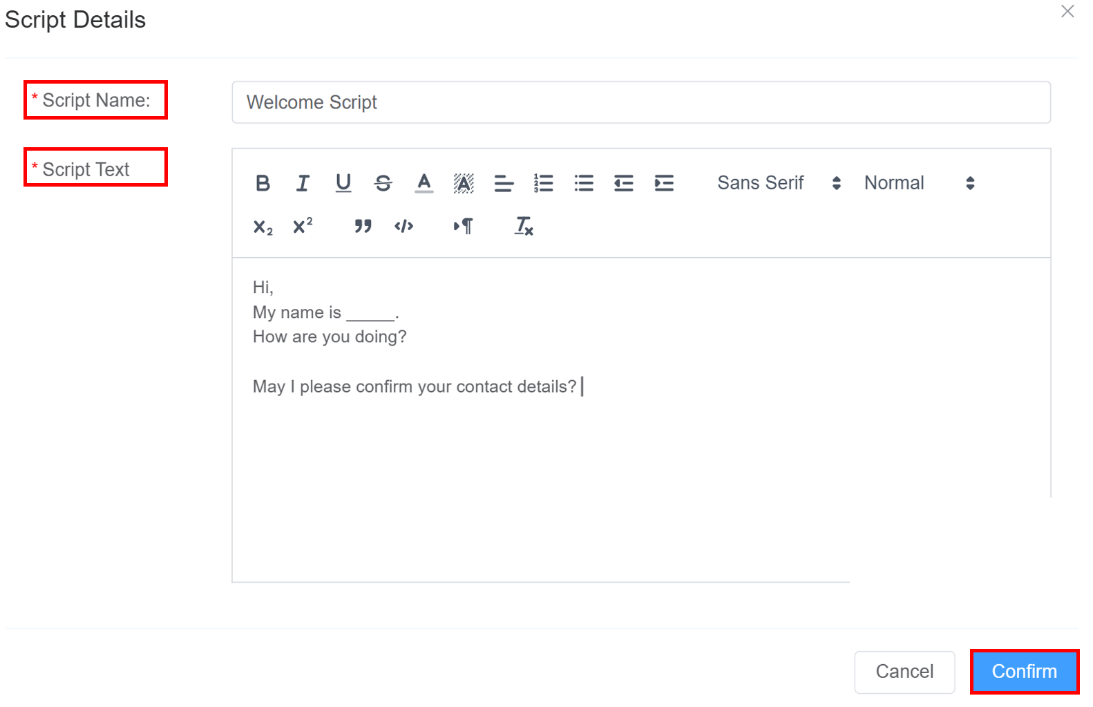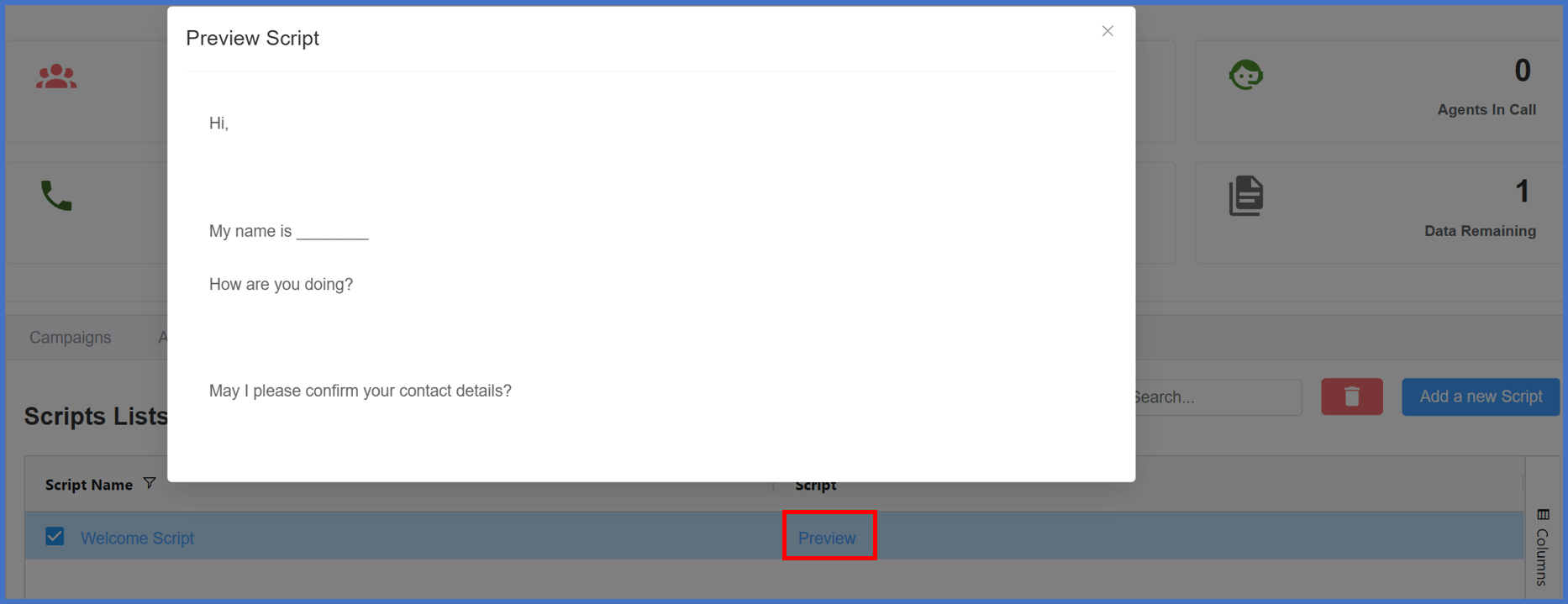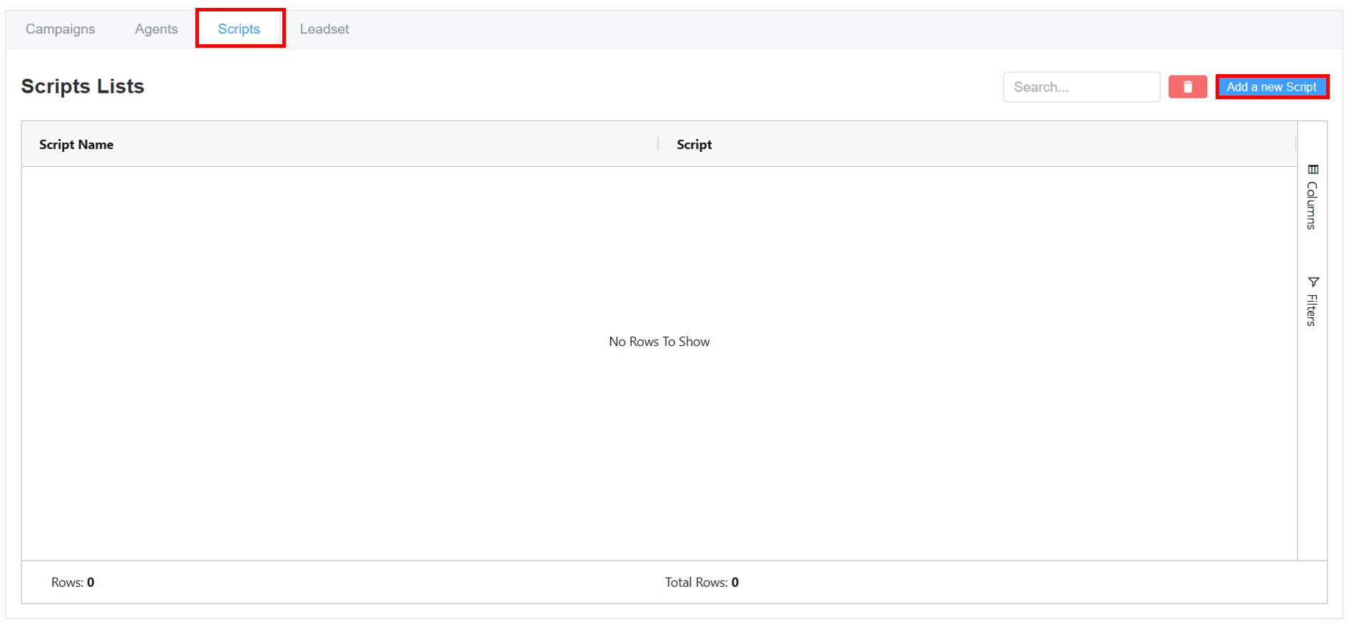 The Script section enables you to create structured call scripts for agents to follow during customer interactions.