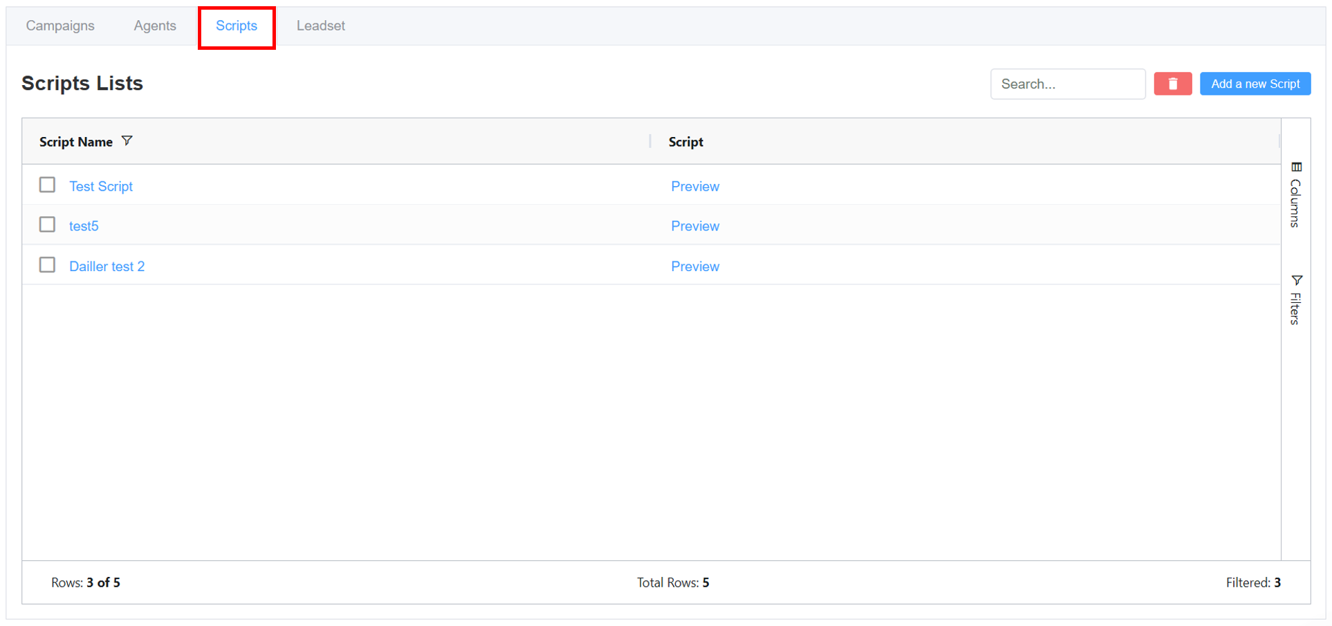 Displays all the created scripts in the Contact Center. You can also Add a New Script.