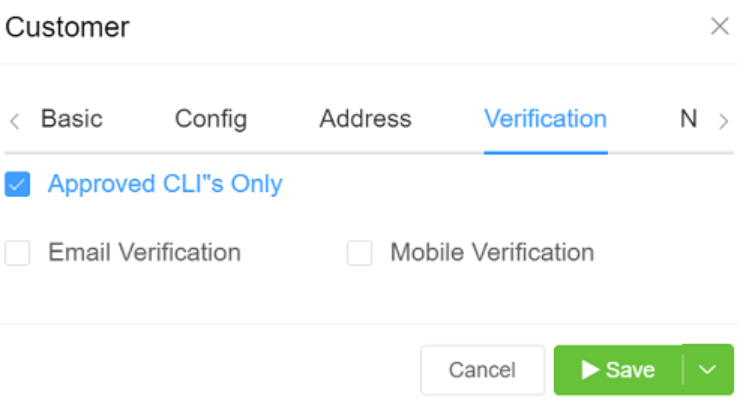 By default, a customer account will pass all calls, even with no configured CLI records. To change this behavior, navigate to Management Customer [Customer Name] Edit Verification and enable Approved CLI's Only.