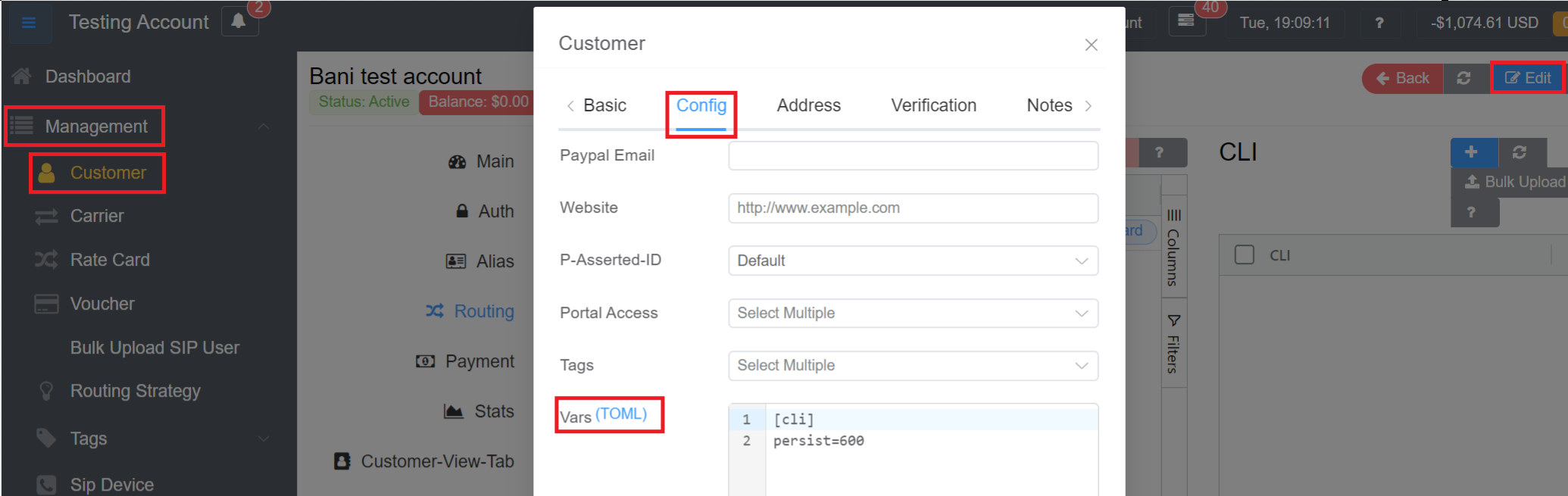 5.Navigate to Management Customer Customer [Name] Edit Config VarsTOML and write the below code: