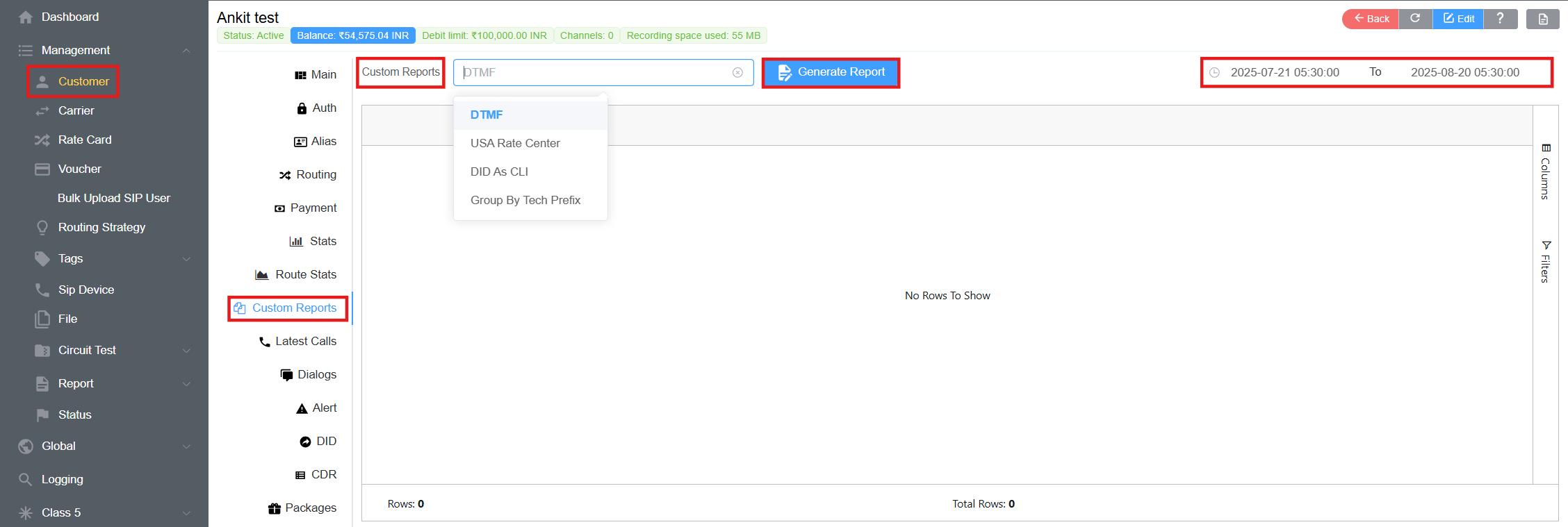 - Navigate to Management Customer Customer [Name] Custom Reports.