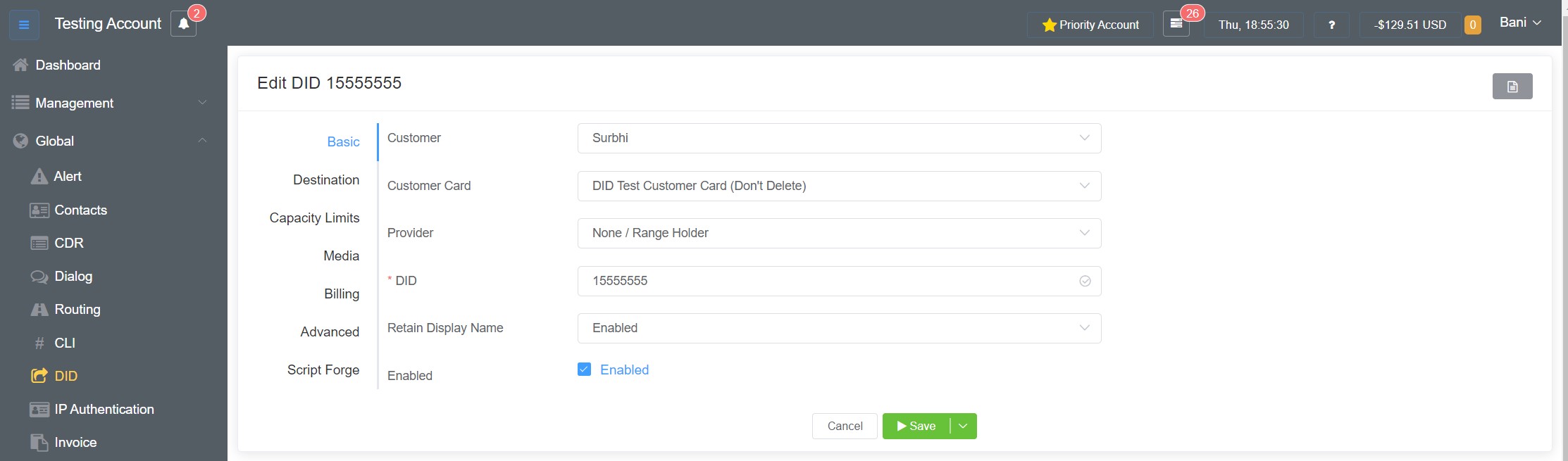 You can also configure and manage a DID for specific Customers or Carriers in Global DID, which displays all configured DID.