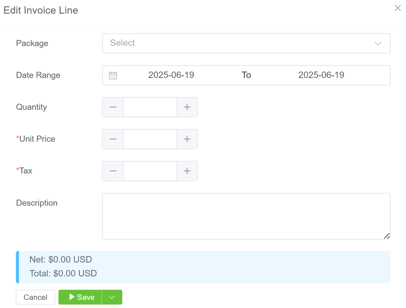 The selected Package will autocomplete the Quantity, Unit Price, and Tax. You can revise these parameters as needed.
