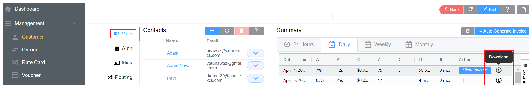 - Navigate to Management Customer Customer [Name] Main Summary Daily, Weekly or Monthly Download Invoice (csv format).