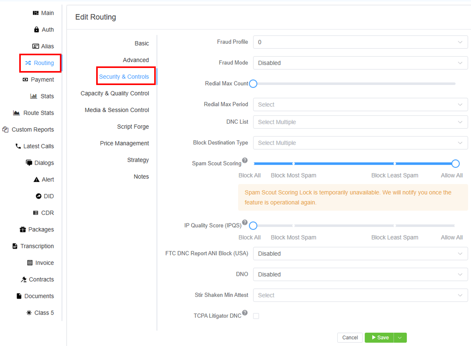 IP Quality Score (IPQS): It blocks spam calls based on CLIs. It won't allow the CLIs of having a specific spam score that you've selected to pass through the system. For more information on IPQS, click here.