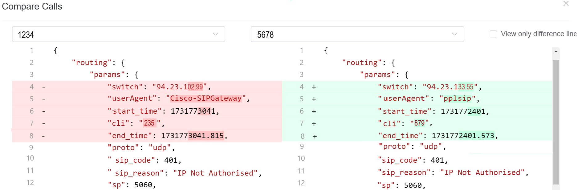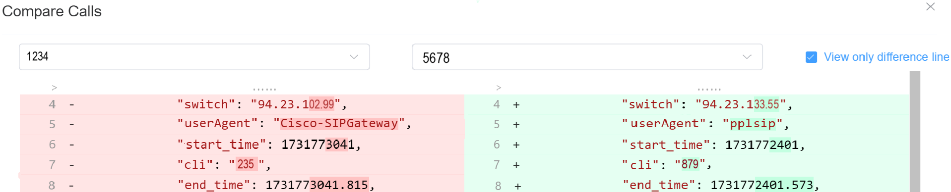View only difference linesto view only the parameters of call logs that differ between two Call IDs.