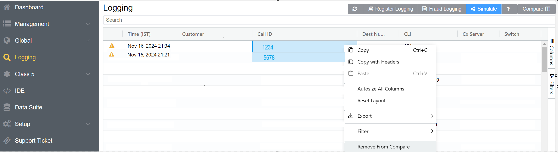 Compare, a widow will appear where you need to select the Call IDs for comparison.
