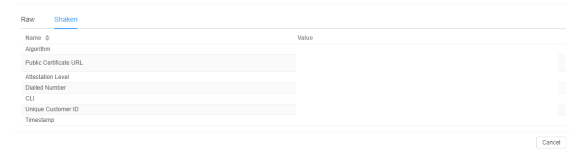 - The Shaken tab will have the decoded information from the Raw tab like Algorithm, Public Certificate URL, Attestation Level, Dialled Number, CLI, Unique Customer ID, Timestamp.