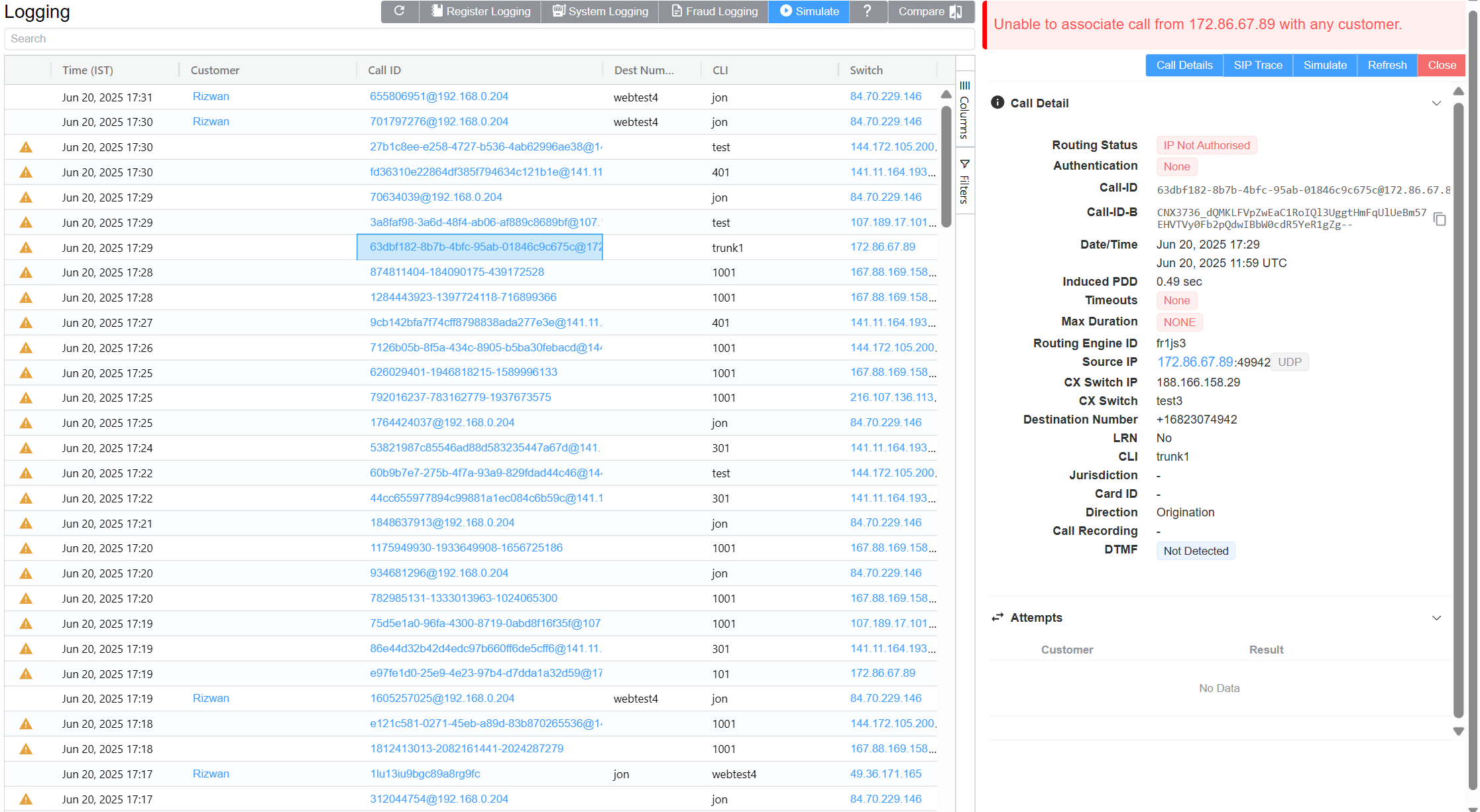 The simulation call result will appear in logging. The Call ID will begin with a SIM tag. Click the Call ID to view the call's routing status.