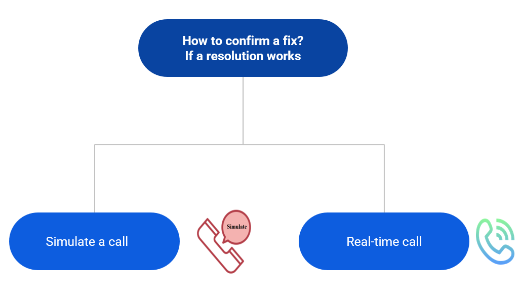 It may require simulating a call, or sometimes you're required to make a real-time call. Thus, it's important to test the resolution yourself before informing the other parties.