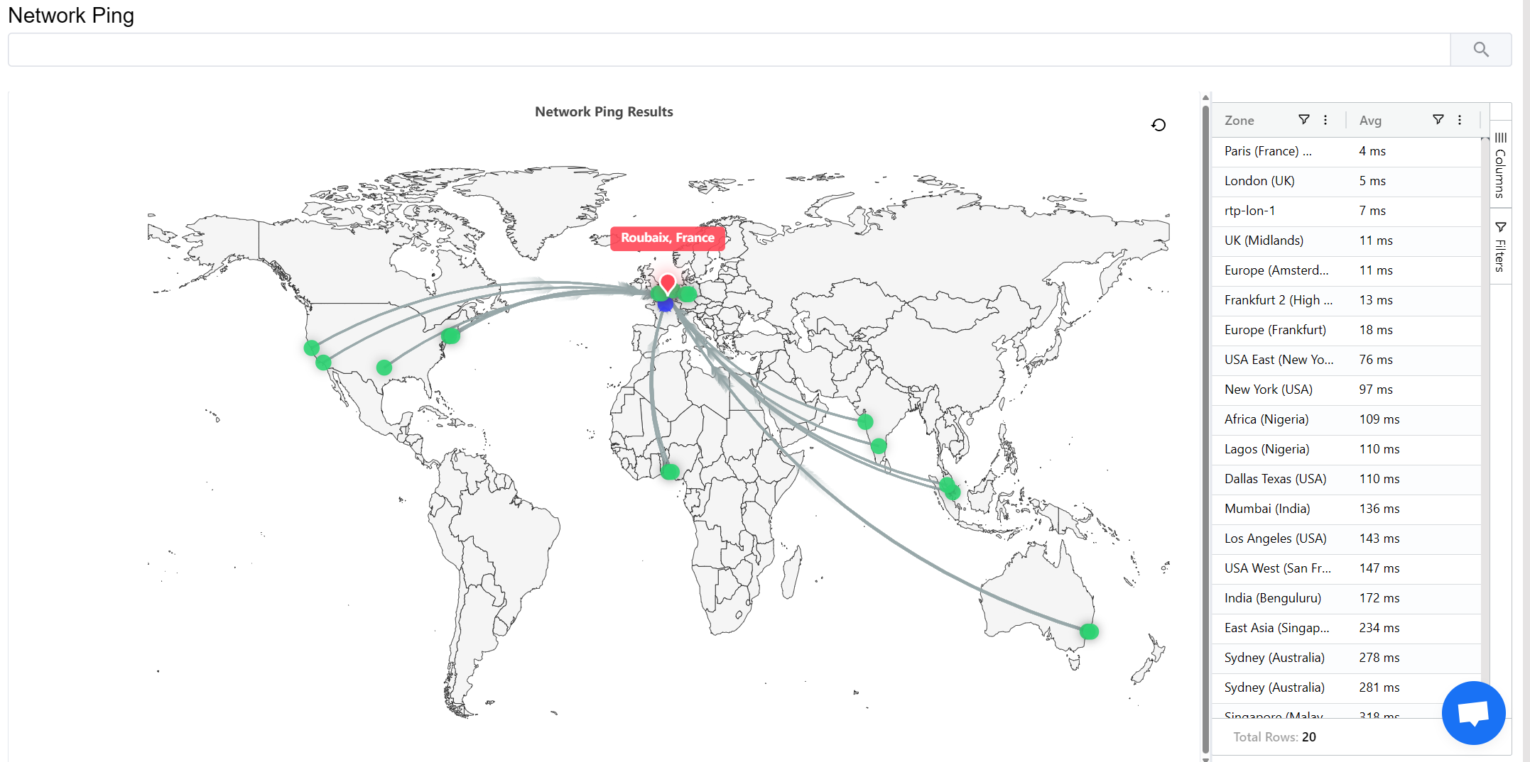 - Each connection displays a ping turnaround time, showing how quickly each zone reaches the target.